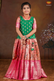 Girls Pink Lilly JKD Green Pattu Pavadai in Elbow Sleeve !!!