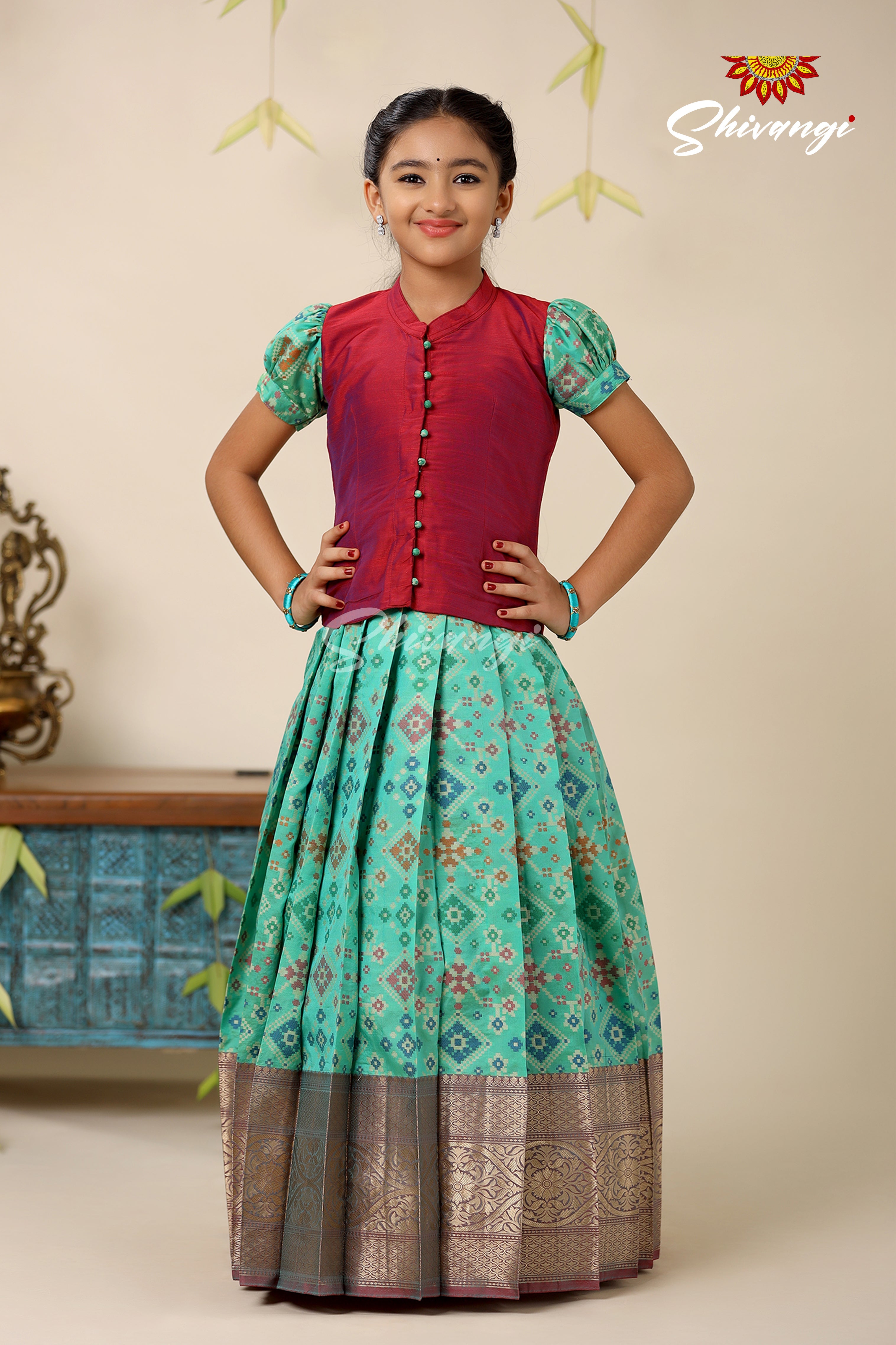 Floral Patola Green Pattu Pavadai For Girls - Festive Wear!!!
